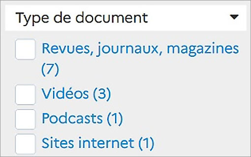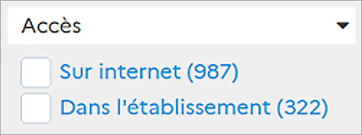 Ainsi, si l’usager clique sur la valeur « Sur internet », il retrouve l’ensemble des ressources uniquement accessibles en ligne.