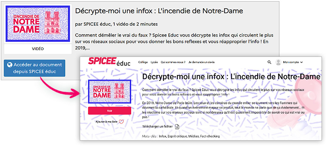 Les différents accès aux notices de vidéos de SPICEE éduc depuis le portail e-sidoc