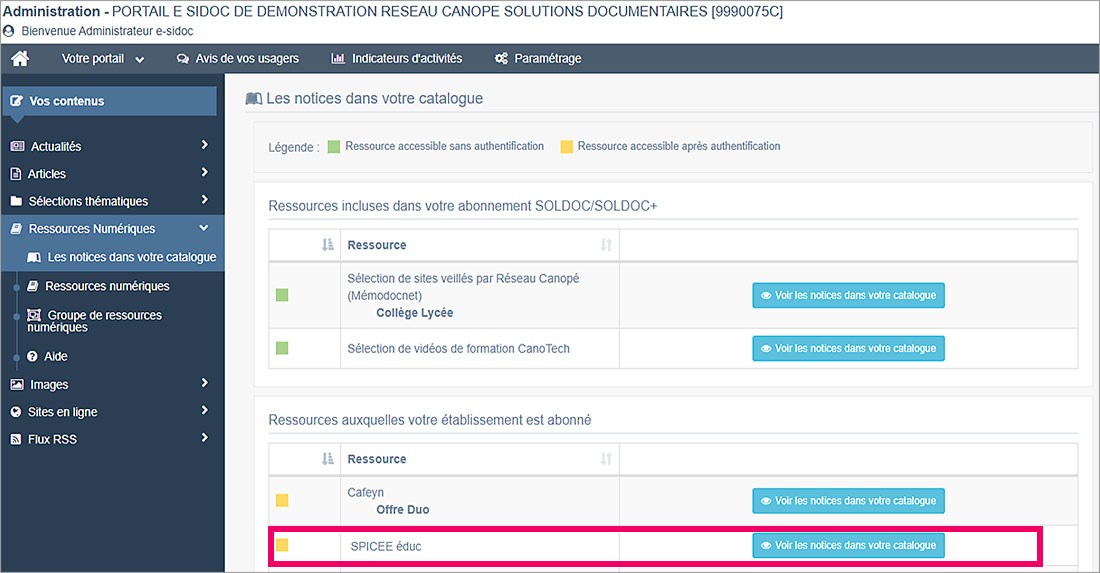-  Soit depuis le back office d’administration du portail : depuis « Vos contenus > Ressources numériques », sélectionner « Les notices dans votre catalogue » puis dans le bloc « Ressources auxquelles votre établissement est abonné », cliquer sur le bouton bleu « Voir les notices dans votre catalogue »