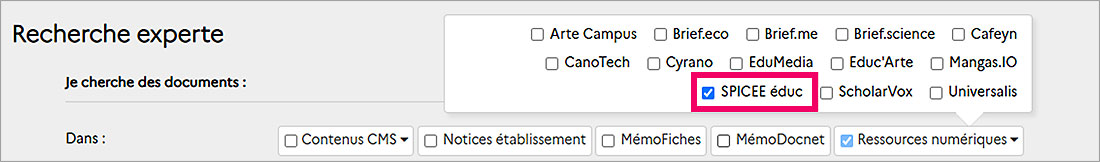 -  Soit depuis l’interface publique authentifiée en administrateur : depuis le mode de recherche experte, sélectionner « SPICEE éduc» dans Ressources numériques