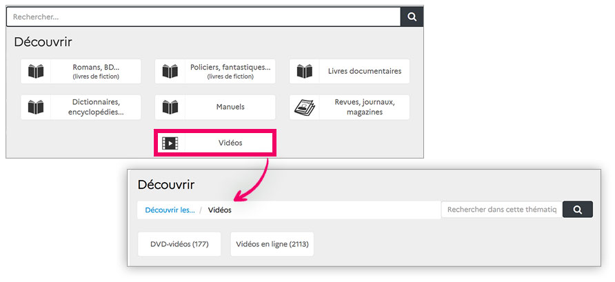 En recherche simple, lorsqu’on clique dans la barre de recherche, l’option « Découvrir » s’ouvre. Elle permet de découvrir les collections à travers plusieurs catalogues. Ces catalogues prédéfinis, sont constitués automatiquement en fonction de la nature, du type ou du support des documents présents dans le portail. La présence ou non de ces catalogues dans l’option « Découvrir » est paramétrable.