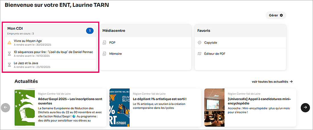 -  L’activation du widget « Mon CDI » est automatique. Chaque usager en dispose depuis sa page d’accueil sur l’ENT de son établissement.