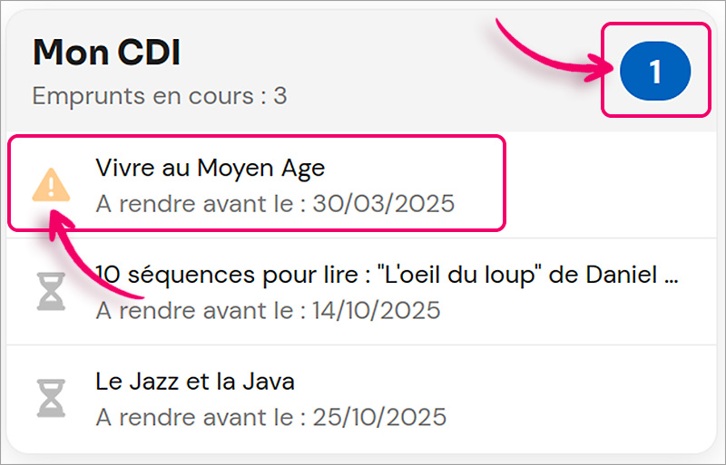 Un pictogramme d’alerte signale l’usager du dépassement de la date de retour.