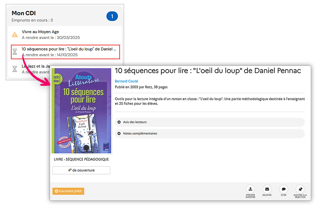 Un élève ou enseignant authentifié dans l’ENT peut, d’un simple clic, prendre connaissance de la situation de ses prêts effectués au CDI de son établissement depuis le widget « Mon CDI ».