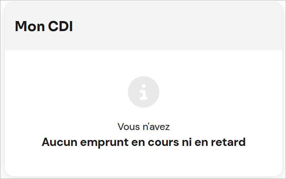 Lorsqu’un usager n’a ni document en prêt ni document en retard, ces informations sont mentionnées ainsi dans le widget.